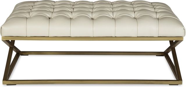 Modern finesse and a striking silhouette bring sophistication and interest to your living room with this gorgeous leather and metal cocktail ottoman. It features a satin brass finish with X shape detailing and a plush tufted top. Also available in Soft Nickel finish as style L088200.Read More