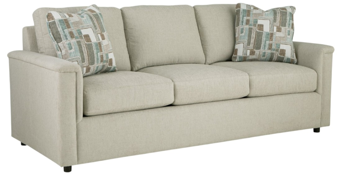 Designed to fit smaller living spaces, this 79" sleeper sofa features padded track arms, loose back pillows, French seaming, and plush Comfort Soft cushions. Sleeper mechanism features an adjustable head rest.Read More