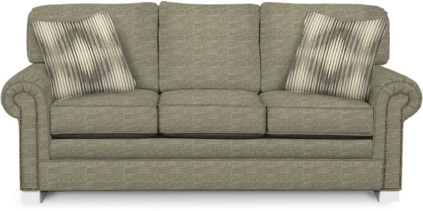 Casual sophistication comes to life in this updated classic sleeper sofa. Dark brass nail heads trim the arm panels and accent the pleated rolled arms- set at the perfect height for a good nap! Three seat cushions and three attached backs provide a plush, comfortable place to relax. Tapered block legs offer a modern touch to this simple, but refined look. Also available are the matching sofa (no sleeper), loveseat, chair and ottoman. Optional nail finisehs available. Available without nail head trim as style 7566.