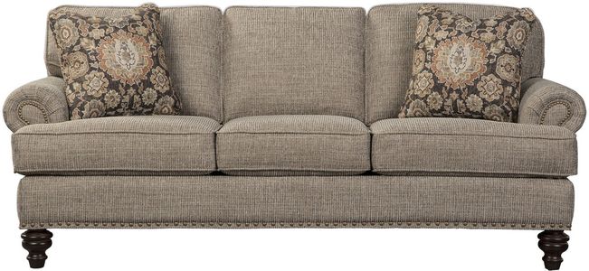 Lots of unique details are brought together in this one sofa to give it a look all its own. Traditional elements like nail head trim around the arm panels and base, classic Lawson rolled arms, and beautiful turned legs are just a few things you will find familiar about this piece. It features attached box-border back pillows and 3 plush seat cushions to give you a neat, yet perfectly comfortable style. A pair of accent pillows as well as a kidney pillow complete the look. Optional nail finishes available. Also available are the matching loveseat, chair 1/2, ottoman, and queen sleeper.