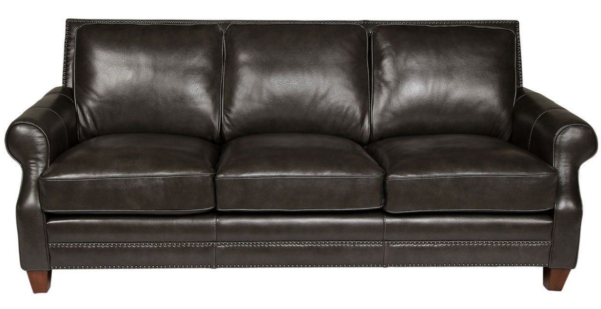 Soft and supple gray leather contrasts with brass nail head trim in this updated traditional style. Double rows of nails are located around the top rail as well as across the front rail for a neat and pulled together feeling. Welted sock arms and tapered legs complete the look. Also available are the matching loveseat, chair, ottoman, and recliner.