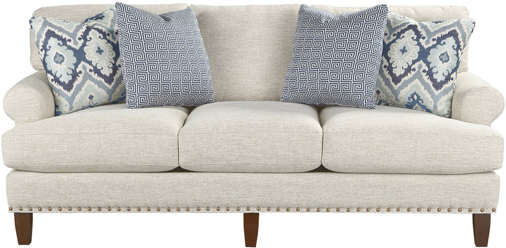 A peaceful oasis for your home, this relaxed casual sofa has familiar design elements with built in comfort. It feels roomy, but at only 84" long, it's scaled for most any living space. Featuring loose box border backs, simple sock arms, premium cushioning, French seaming, and brass nail head trim along the base, this 3 seat style comes standard with two pairs of toss pillows as shown. Also available with no nailhead trim as style 7675. Also available are the matching sectional, loveseat, chair and ottoman.