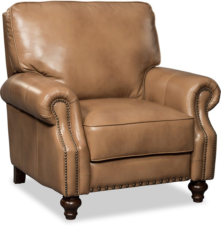 Casual and familiar, this all leather recliner features a plush back, coil cushions, and bold brass nail head trim around the arms and base. Please see style L1714 for other available pieces in this group.