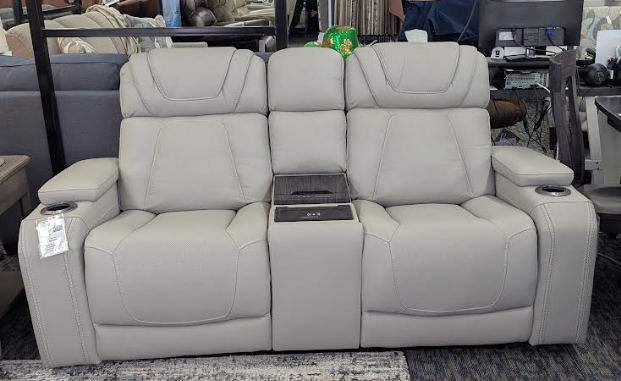 Indulge in luxurious relaxation with our light grey dual power reclining loveseat. Featuring headrests, console, cup holders, and a built-in refrigerator, this loveseat elevates your lounging experience.Read More