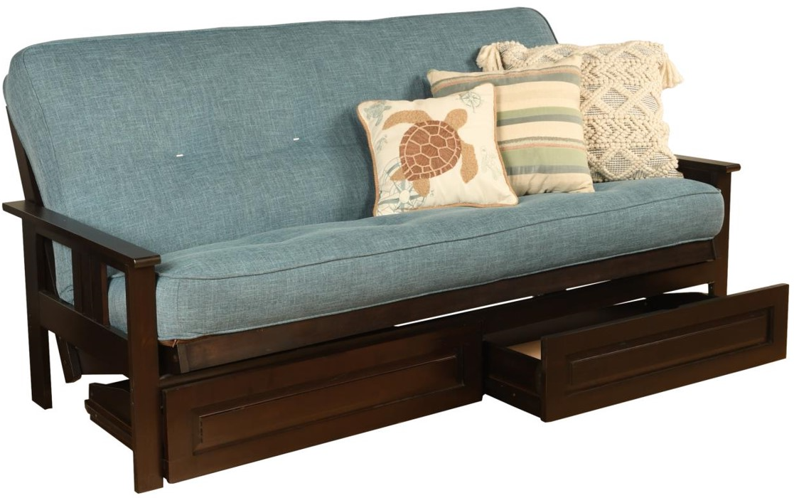 The mission style design on the arms of this solid wood futon frame cradle your mattress for sleeping comfort pillows and sheets stay put when using it as a bed. This easy-to-adjust frame comes in an array of colors and the comfort of sofa height seating.Read More