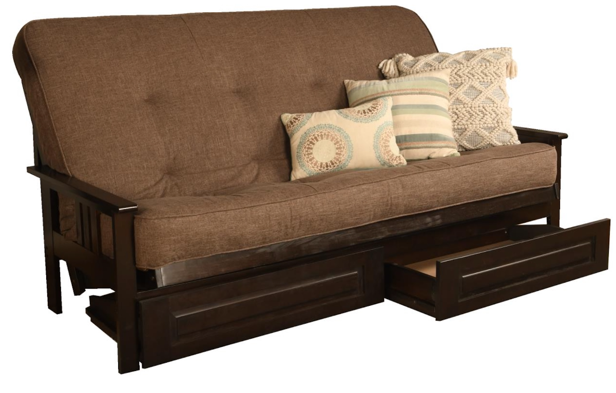 The mission style design on the arms of this solid wood futon frame cradle your mattress for sleeping comfort -- pillows and sheets stay put when using it as a bed. This easy-to-adjust frame comes in an array of colors and the comfort of sofa height seating.Read More