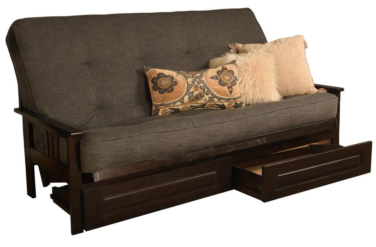 The mission style design on the arms of this solid wood futon frame cradle your mattress for sleeping comfort -- pillows and sheets stay put when using it as a bed. This easy-to-adjust frame comes in an array of colors and the comfort of sofa height seating.Read More
