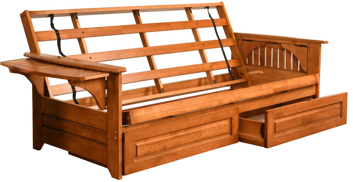 The Phoenix futon frame is a classic hardwood frame with tray style arms. This unique and versatile full-size futon frame easily converts to a Bed. It offers three positions - sit, lounge and sleep to seemlessly transition from day to night. The included drawers offer plenty of additional storage space.Read More