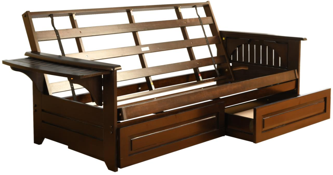 The Phoenix futon frame is a classic hardwood frame with tray style arms. This unique and versatile full-size futon frame easily converts to a Bed. It offers three positions - sit, lounge and sleep to seemlessly transition from day to night. The included drawers offer plenty of additional storage space.Read More