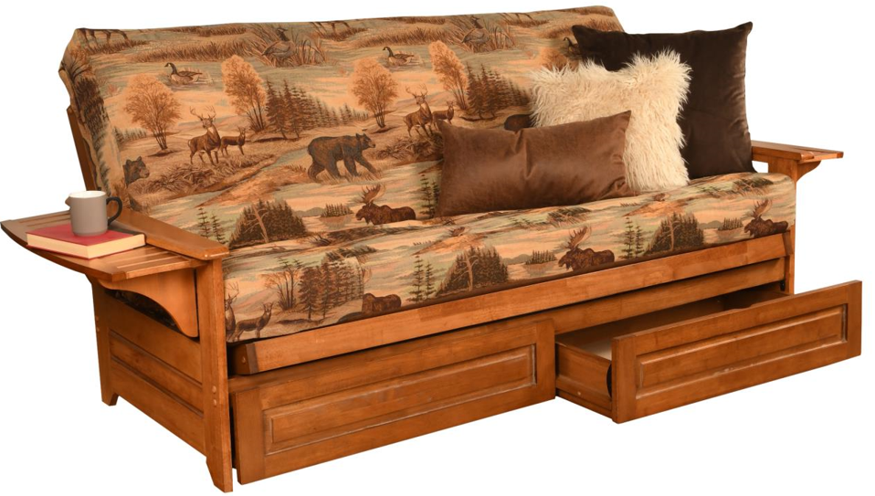 The Phoenix futon is a classic hardwood frame with tray style arms. This unique and versatile full-size futon sofa easily converts to a Bed. It offers three positions - sit, lounge and sleep to seemlessly transition from day to night. This multifunctional piece of furniture can find a home.Read More