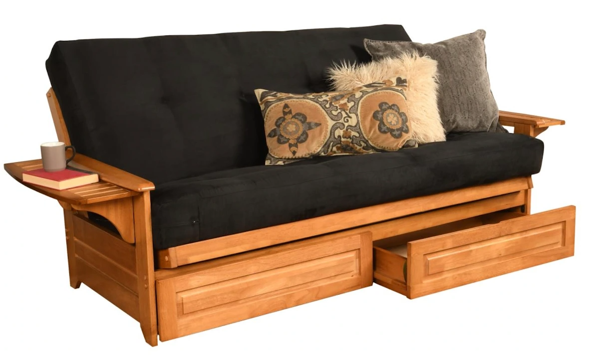 The Phoenix futon is a classic hardwood frame with tray style arms. This unique and versatile full-size futon sofa easily converts to a Bed. It offers three positions - sit, lounge and sleep to seemlessly transition from day to night. The included drawers offer plenty of additional storage space.Read More