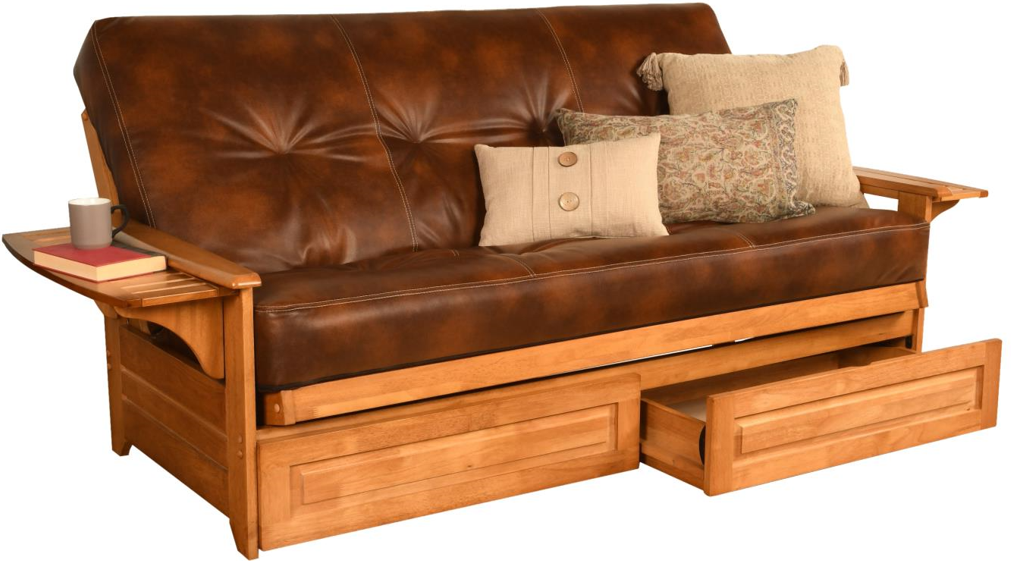 The Phoenix futon is a classic hardwood frame with tray style arms. This unique and versatile full-size futon sofa easily converts to a Bed. It offers three positions - sit, lounge and sleep to seemlessly transition from day to night. The included drawers offer plenty of additional storage space.Read More