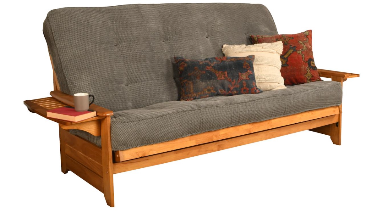 The Phoenix futon is a classic hardwood frame with tray style arms. This unique and versatile queen-size futon sofa easily converts to a Bed. It offers three positions - sit, lounge and sleep to seemlessly transition from day to night. This multifunctional piece of furniture can find a home in just about any type of room.Read More