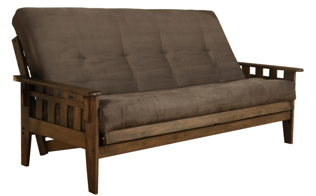 This full-size futon is made from sustainable, plantation-grown hardwood and has been finished with lush walnut brown stain, allowing the beauty of the woodgrain to show.