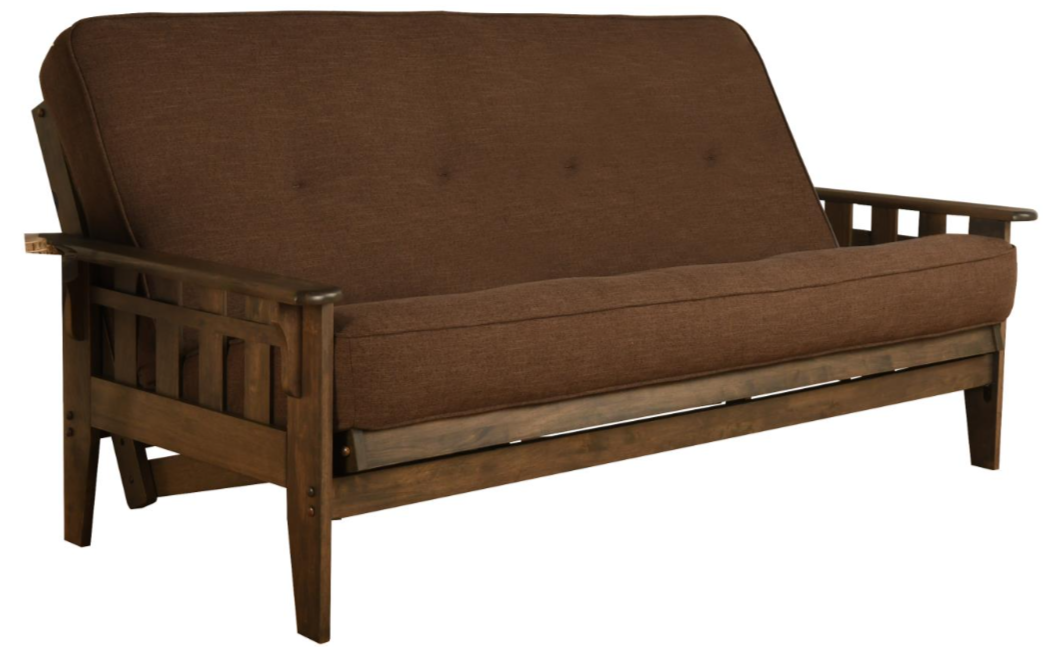 Classic charm combines with modern convenience with this solid wood futon. This full-size futon is made from sustainable, plantation-grown hardwood and has been finished with lush walnut brown stain, allowing the beauty of the woodgrain to show. Everything you need to set up your futon frame is included; no additional tools are required and easily adjusts from sitting to sleeping positions.Read More