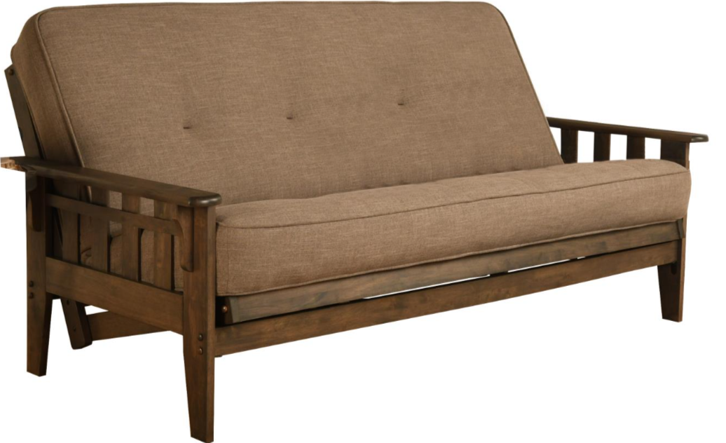 This full-size futon is made from sustainable, plantation-grown hardwood and has been finished with lush walnut brown stain, allowing the beauty of the woodgrain to show.
