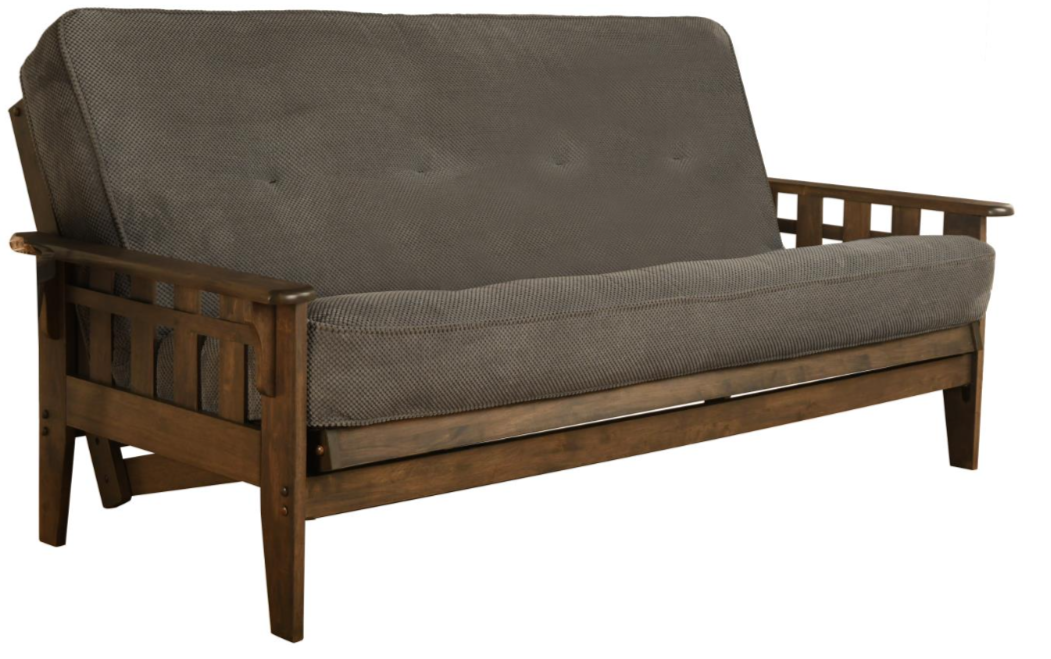 Classic charm combines with modern convenience with this solid wood futon. This full-size futon is made from sustainable, plantation-grown hardwood and has been finished with lush walnut brown stain, allowing the beauty of the woodgrain to show. Everything you need to set up your futon frame is included; no additional tools are required and easily adjusts from sitting to sleeping positions.Read More