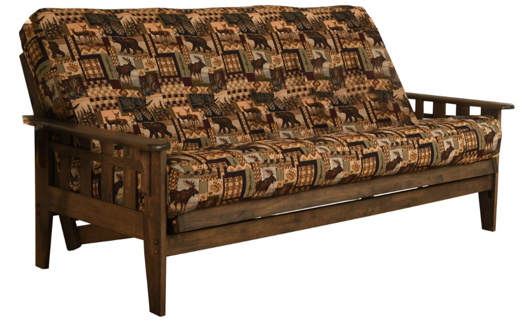 Classic charm combines with modern convenience with this solid wood futon. This full-size futon is made from sustainable, plantation-grown hardwood and has been finished with lush walnut brown stain, allowing the beauty of the woodgrain to show. Everything you need to set up your futon frame is included; no additional tools are required and easily adjusts from sitting to sleeping positions.Read More