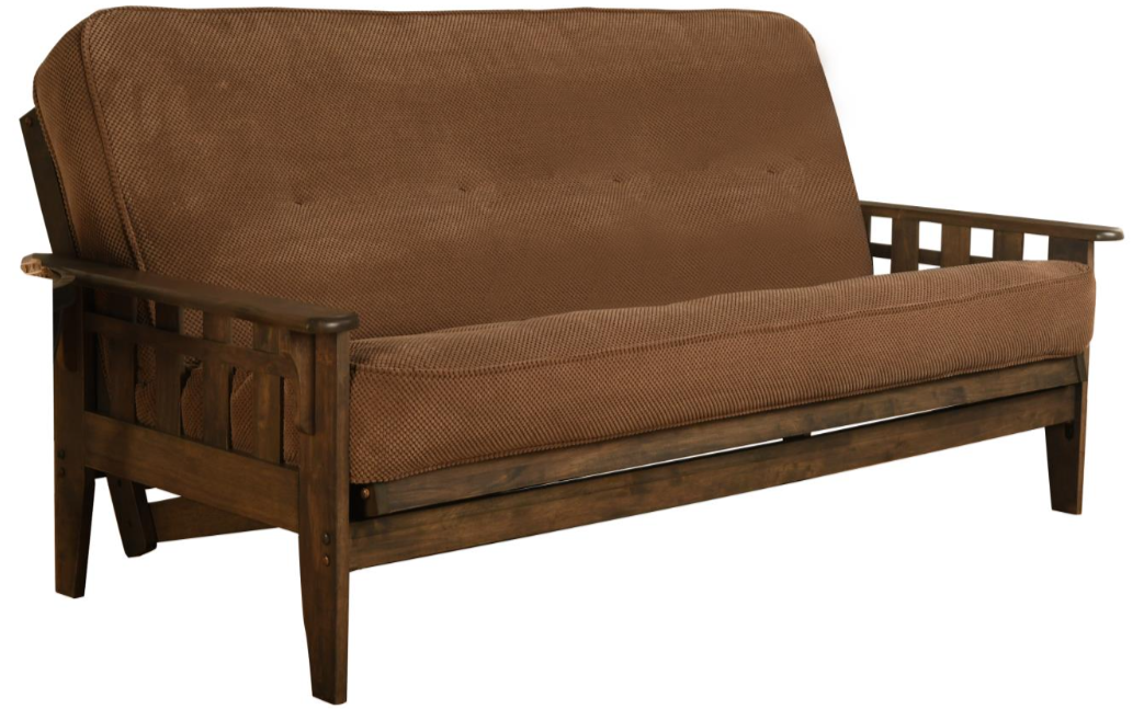 This full-size futon is made from sustainable, plantation-grown hardwood and has been finished with lush walnut brown stain, allowing the beauty of the woodgrain to show.