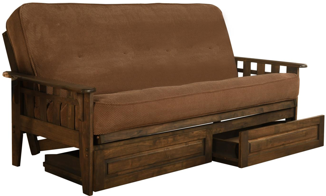 Classic charm combines with modern convenience with this solid wood futon with storage drawers. This full-size futon is made from sustainable, plantation-grown hardwood and has been finished with lush walnut brown stain, allowing the beauty of the woodgrain to show.Read More