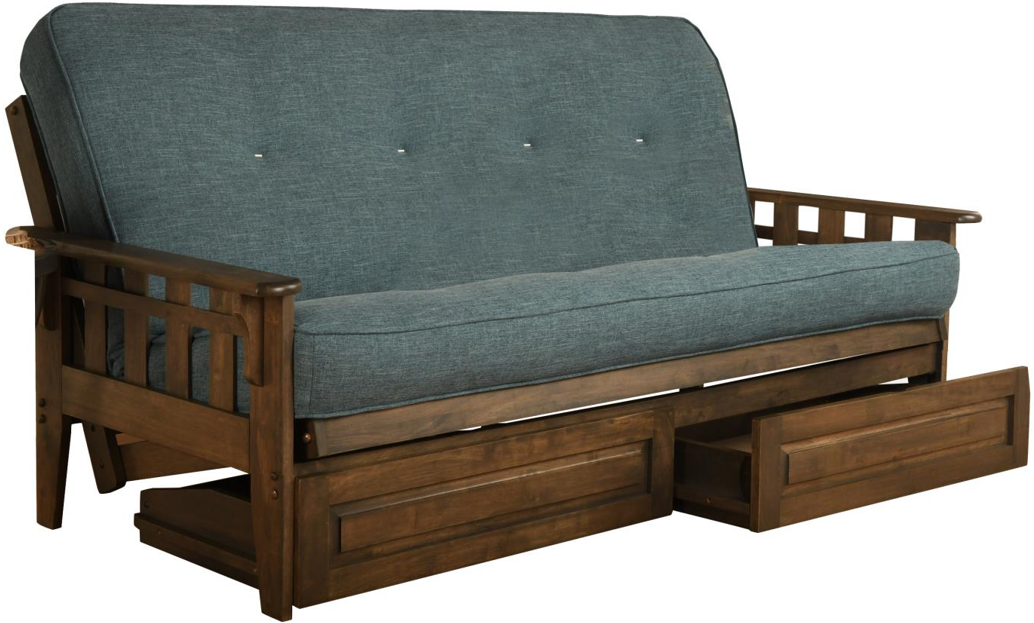 Classic charm combines with modern convenience with this solid wood futon with storage drawers. This full-size futon is made from sustainable, plantation-grown hardwood and has been finished with lush walnut brown stain, allowing the beauty of the woodgrain to show.Read More