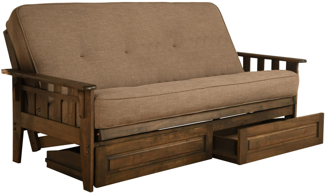Classic charm combines with modern convenience with this solid wood futon with storage drawers. This full-size futon is made from sustainable, plantation-grown hardwood and has been finished with lush walnut brown stain, allowing the beauty of the woodgrain to show.Read More