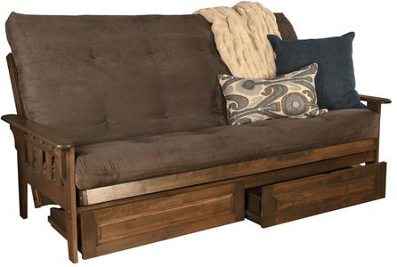 Classic charm combines with modern convenience with this solid wood futon with storage drawers. This queen-size futon is made from sustainable, plantation-grown hardwood and has been finished with lush walnut brown stain, allowing the beauty of the woodgrain to show.Read More