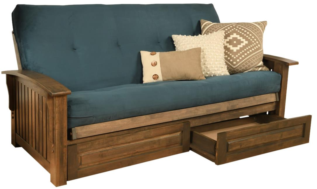 This full-size futon has three positions allowing you to sit or lounge or sleep while the slatted arms have a gentle curve to fit your body. The included drawers provide plenty of space for out-of-site storage.