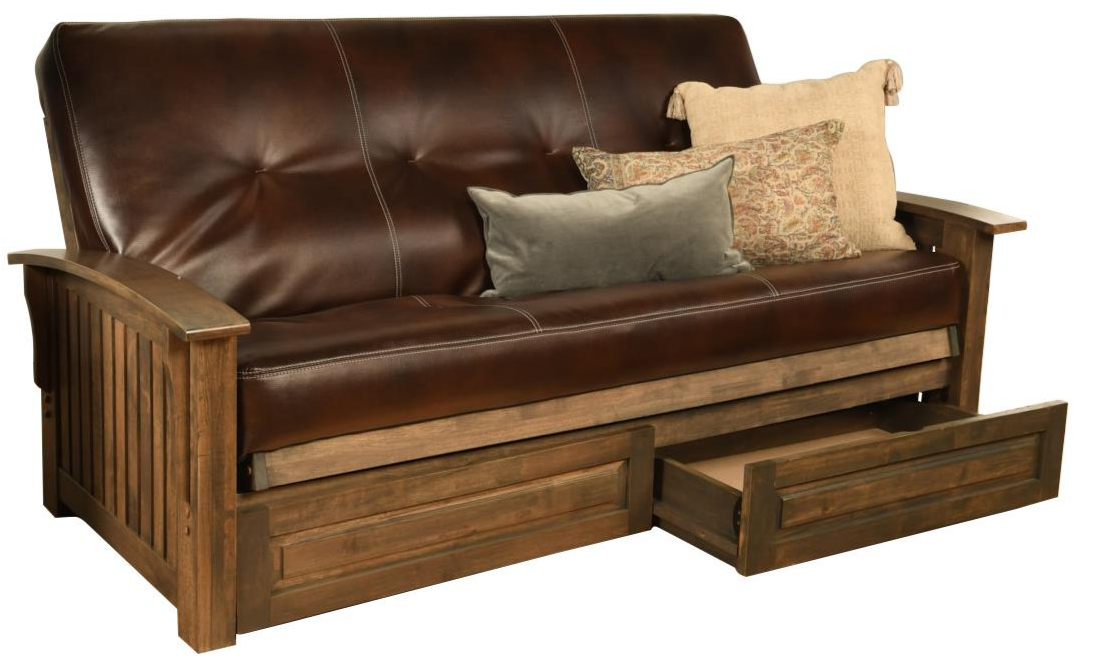 This full-size futon has three positions allowing you to sit or lounge or sleep while the slatted arms have a gentle curve to fit your body. The included drawers provide plenty of space for out-of-site storage.