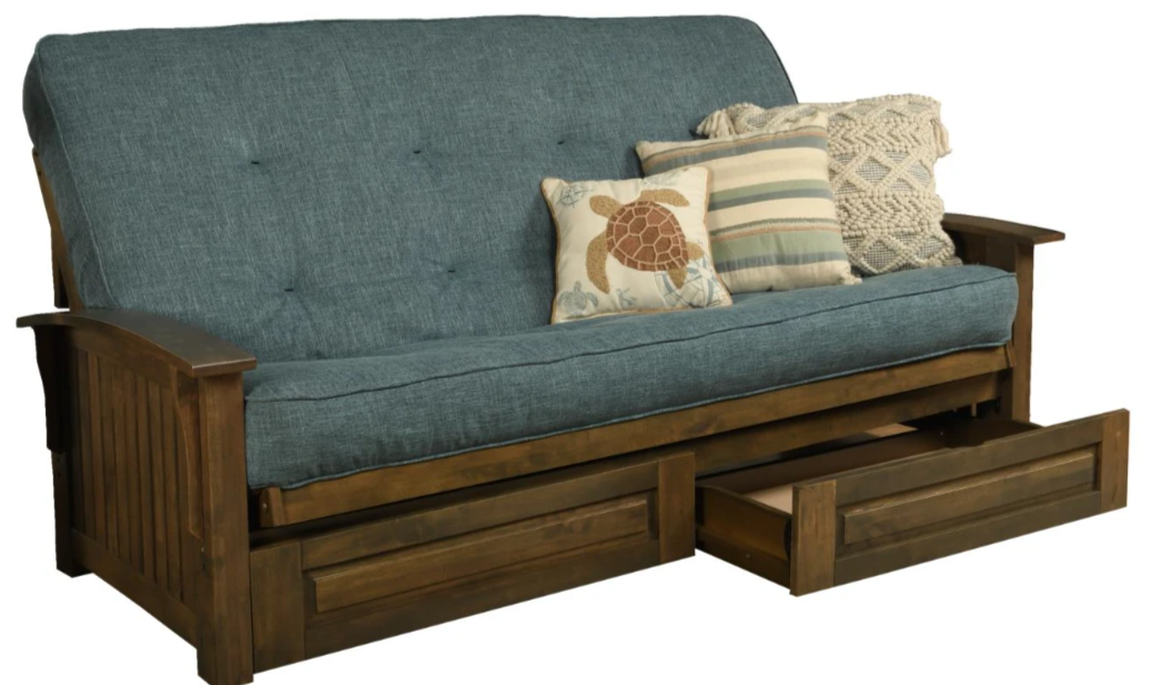 This queen-size futon has three positions allowing you to sit or lounge or sleep while the slatted arms have a gentle curve to fit your body. The included drawers provide plenty of space for out-of-site storage.