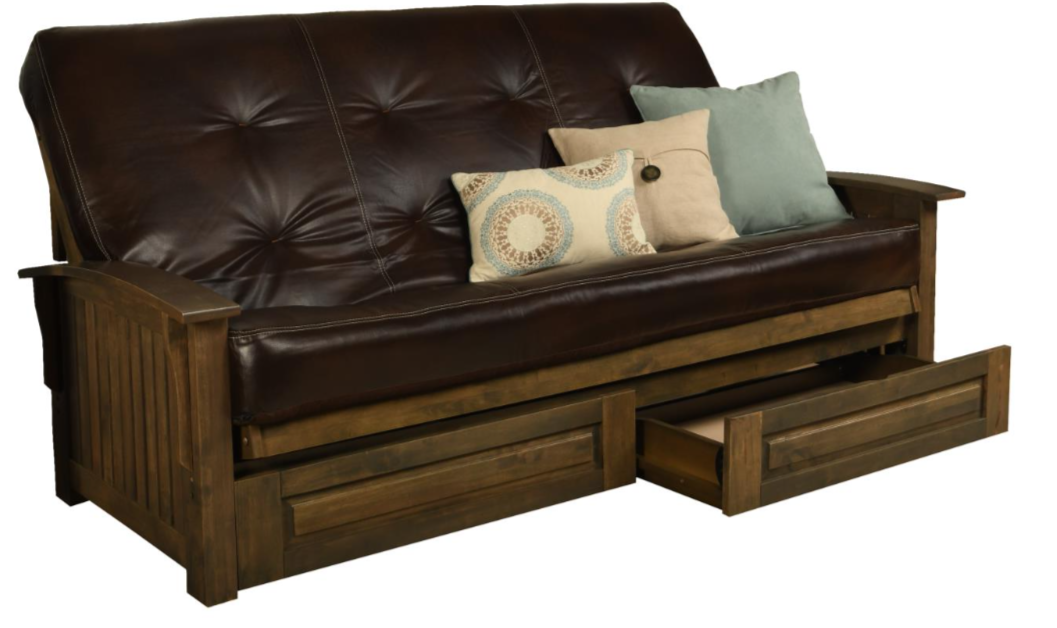 This queen-size futon has three positions allowing you to sit or lounge or sleep while the slatted arms have a gentle curve to fit your body. The included drawers provide plenty of space for out-of-site storage.