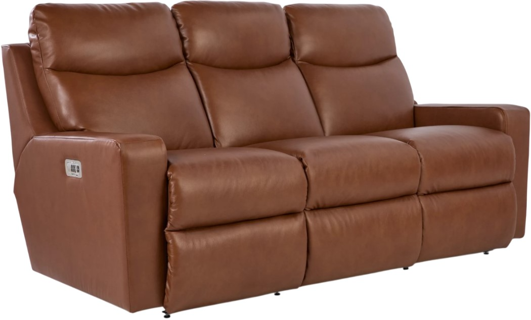 The bold track arms and exposed wings of the Emmons Power Reclining Sofa with Headrest and Lumbar add a linear edge to cozy, laid-back comfort. Tall, cushy backs and smooth chaise recline offer fully adjustable support in the outer seats.Read More