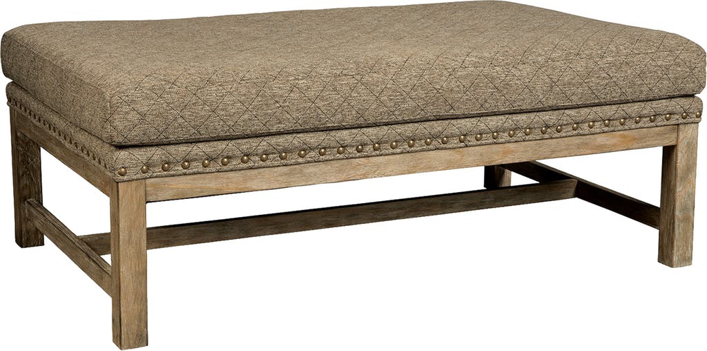 This cocktail ottoman is a great rustic casual piece that works with both traditional and modern settings. It features a wood stretcher base in a Sun-Bleached Cypress finish, as well as spaced brass nailhead trim.