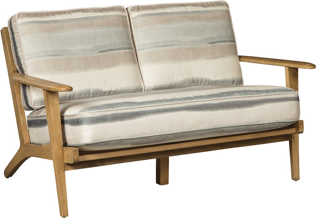 This unique settee features a beautifully finished wood frame in a Cashmere finish to give a warm and casual touch to your home. Loose backs and Rachael's exclusive Comfort Coil seat cushions provide support and comfort. Slatted back. Also available with a contrasting stripe on the back cushion using style number R069130CL. Also available is the matching chair.Read More