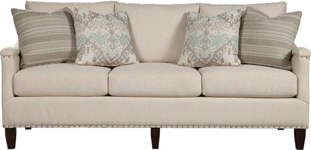 Classic details with a new perspective! This moderately scaled sofa features a sloping cap arm accented by pewter nail head trim around the arms and base, including the back of the sofa. French seaming and tall tapered legs give this piece a tailored, modern approach to traditional styling. Rachael's exclusive Comfort Coil cushion provides remarkable seating. Also available are the matching loveseat, chair and ottoman. Also available with brass nail heads as style R761350CL.Read More