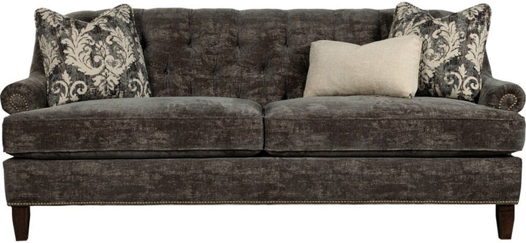 This tufted back sofa grounds any living room with its beautiful wing shape and delicate arm. Classic vintage detailing is what sets it apart- notice the brass nail head trim that frames the base of the sofa (including the back) and the front of the arms. Rachael's exclusive Comfort Coil seat cushion makes this sofa your soft place to land at the end of the day. Standard with 3 accent pillows as shown. Also available are the matching loveseat, chair and ottoman.Read More