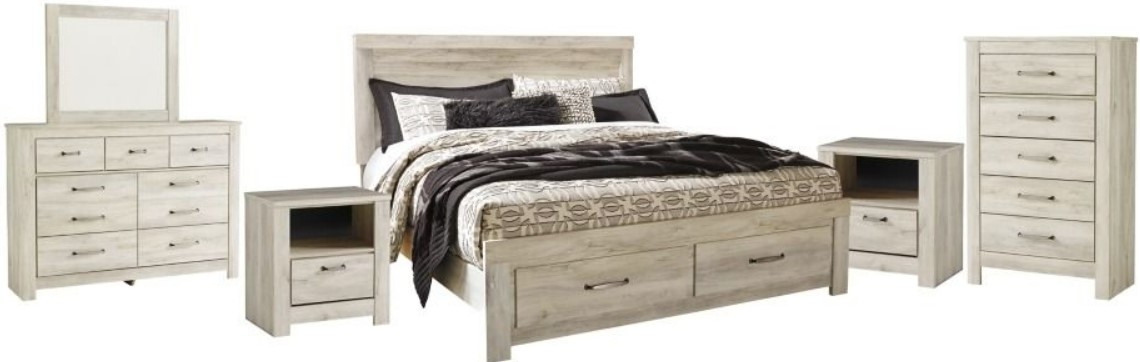 Includes king storage bed (headboard, footboard with 2 storage drawers, rails and slats), 7-drawer dresser and mirror, 5-drawer chest and two 1-drawer nightstands
