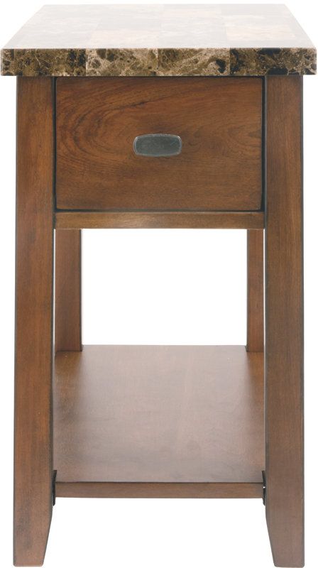 The Breegin side end table features a lower shelf, 1 drawer with pewter-tone pulls, and a spacious, faux-marble table top ensuring there’s no shortage of storage in your home.