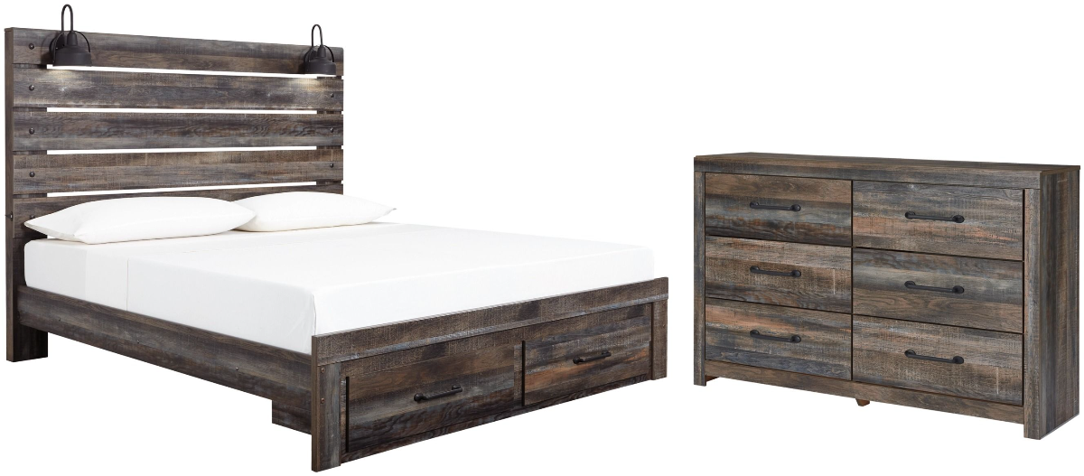 Includes king-size panel bed (headboard, 2-drawer storage footboard and rails) and 6-drawer dresser