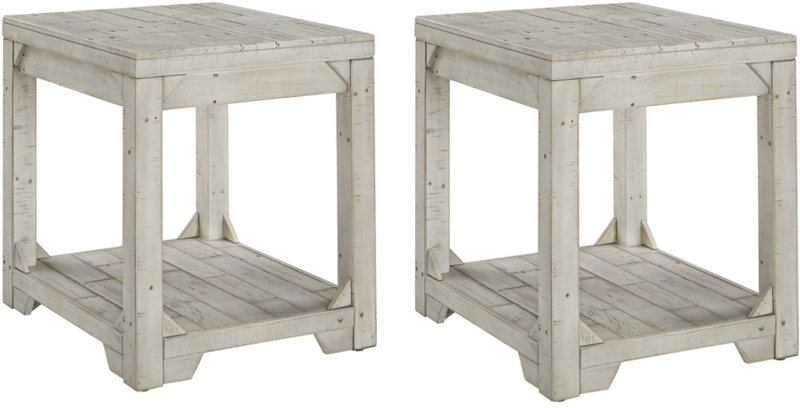 Take in the country fresh look of this 2-piece end table set and connect with a simpler time. Its farmhouse style is evident in its stocky design with planked top/bottom shelf, unique triangle accents and relaxed white washed finish.Read More