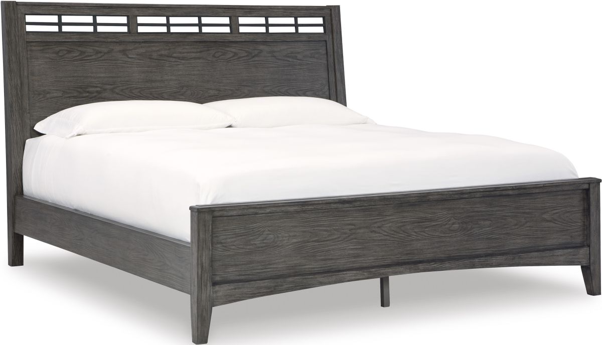 The subtly slanted headboard lets you sit comfortably when reading or working on your laptop in bed. And the medium gray-brown finish with a blackened wood grain contrast is wonderfully easy on the eyes. Includes queen panel headboard, rails and footboard with slats Made with hardwood solids and MDF substrates Medium gray-brown finish with a blackened wood grain contrast; embossed wood grain texture Lay-back headboard Decorative inset metal grille with matte black finish Foundation/box spring required, sold separately Mattress not included, sold separately Home is heritage—and heritage is uncompromising. This means the quality construction, unique stylings, and exceptional comfort of home furnishings from Signature Design by Ashley® always match the integrity of your home and family. The Signature Design by Ashley® line takes pride in its furniture—inspired by the American home for more than 70 years and enriched by you.